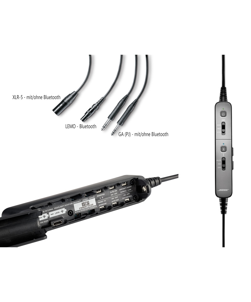 Die Bose ProFlight Series 2 Aviation Headsets sind in folgenden Konfigurationen verfügbar: mit PJ-Steckern (GA, mit oder ohne Bluetooth®), mit 6-Pin LEMO-Stecker (nur mit Bluetooth®), mit XLR-5-Stecker (5-Pin, mit oder ohne Bluetooth®). Bitte wählen Sie Ihre gewünschte Konfiguration oben aus.