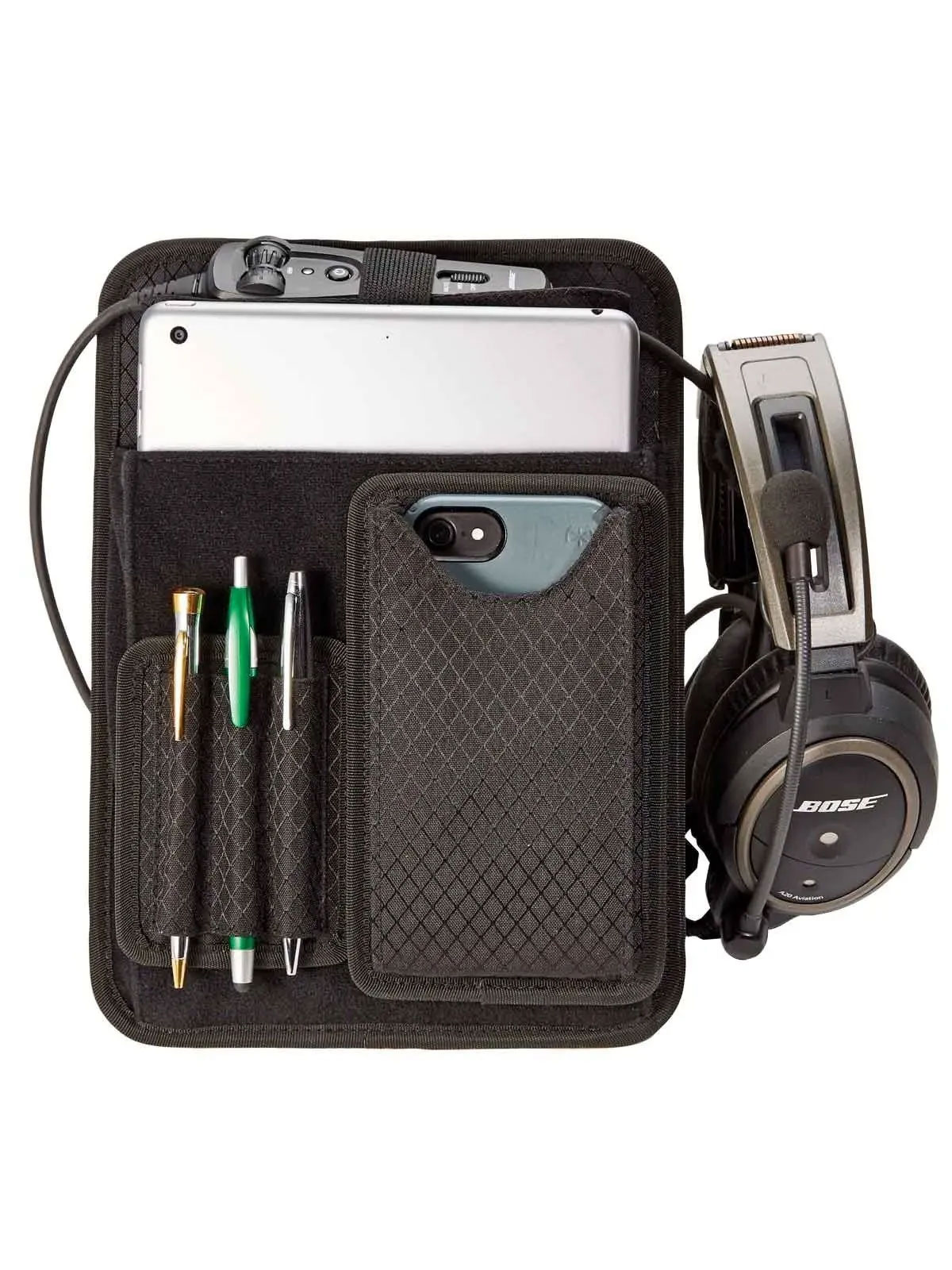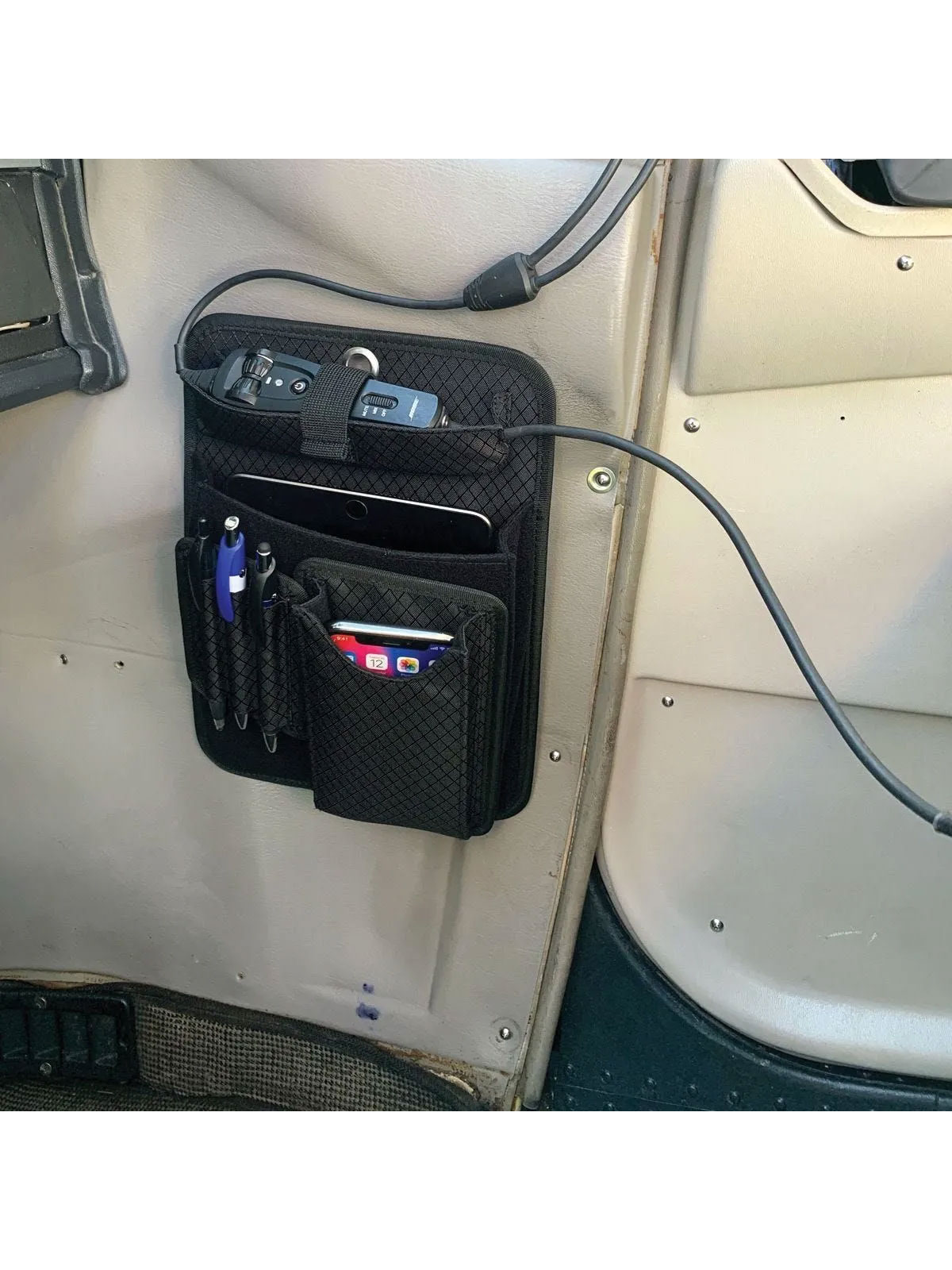 Mit diesem Cockpit Organizer mit Smatphone- und Stifthalter ist Ihr Cockpit stets gut organisiert. Am oberen Rand befindet sich eine Öffnung, die das Steuer-Modul Ihres Headsets aufnehmen kann. Somit ist es stets griffbereit und stört dabei nicht. Das gepolsterte Fach eignet sich perfekt für ein kleines Tablet, Checkliste oder Luftfahrtkarten. Die Befestigungslaschen sind an der Rückseite angenäht. Eine zentrierte Öse am oberen Rand kann zum Aufhängen genutzt werden. Die Oberfläche besteht aus Klettmaterial, an der die kleinen Taschen bestens haften.
