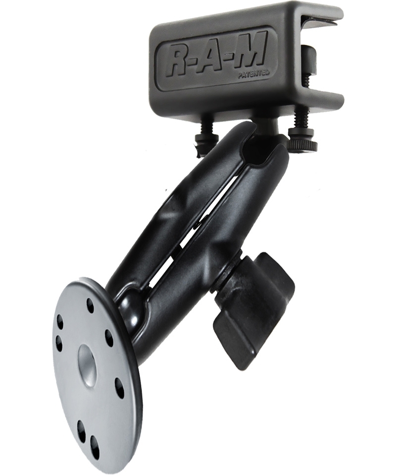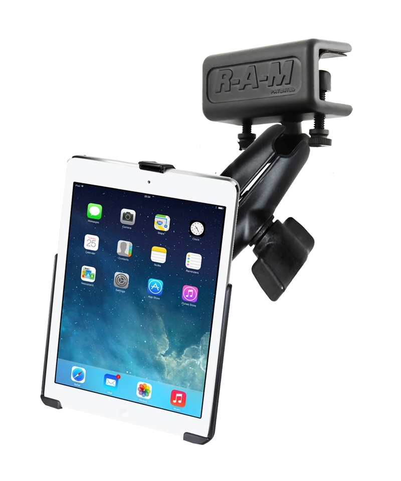 This RAM Mounts complete panel mounting solution for the Apple iPad Air 1-2 / iPad Pro 9.7 (without sleeves or cases) consists of a panel mount clamp (opening 1.1" high, 0.94" deep), a medium double socket arm, a round base plate and an EZ'Roll unit cradle for the device. To mount the base, simply place the clamp on suitable panels and then screw both tight. The hand tightened clamp makes this the perfect mounting system for rental planes.