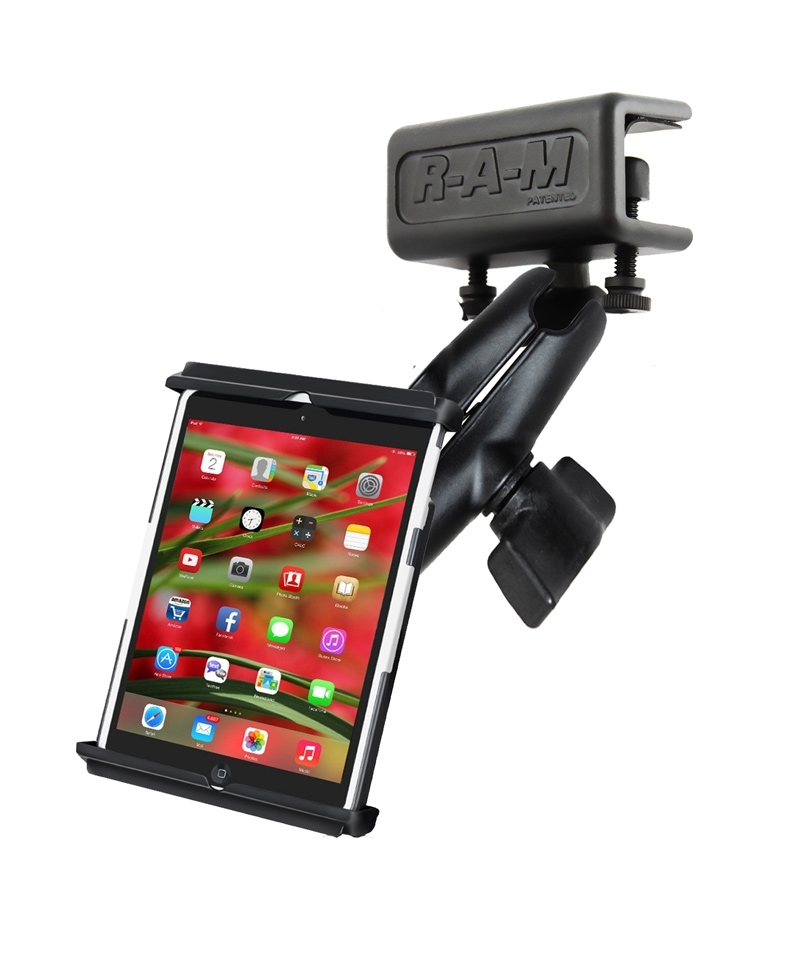 This RAM Mounts complete panel mounting solution for the Apple iPad mini 1-4 (incl. thin sleeves) and other 7" tablets consists of a panel mount clamp (opening 1.1" high, 0.94" deep), a medium double socket arm, a round base plate and the universal Tab-Tite unit cradle for the device. To mount the base, simply place the clamp on suitable panels and then screw both tight. The hand tightened clamp makes this the perfect mounting system for rental planes.