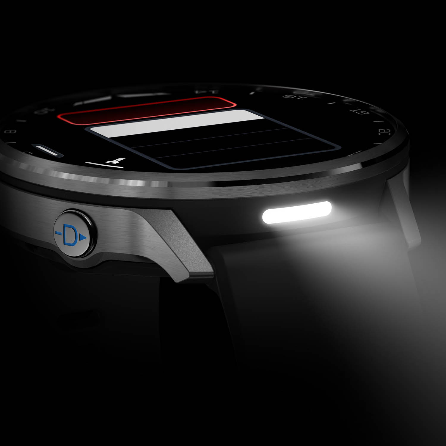 Sensoren - GPS, GLONASS, Galileo, QZSS, BeiDou, Garmin Elevate™ Wrist Heart Rate Monitor, Pulse Ox Blutsauerstoffsättigung , barometricher Höhenmesser, Kompass, Gyroskop, Beschleunigungsmesser, Thermometer, Umgebungs-Lichtsensor