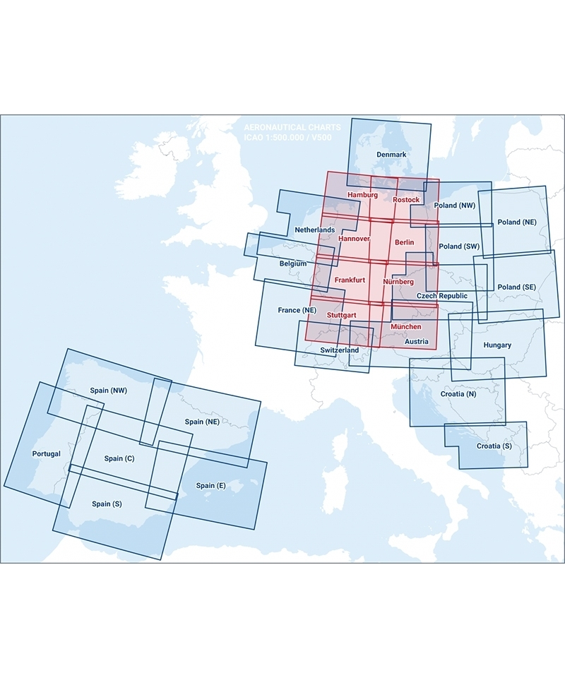 Basierend auf der Harmonisierung europäischer ICAO-Karten haben die Luftraumklassen C, D und E eine blaue Farbgebung.