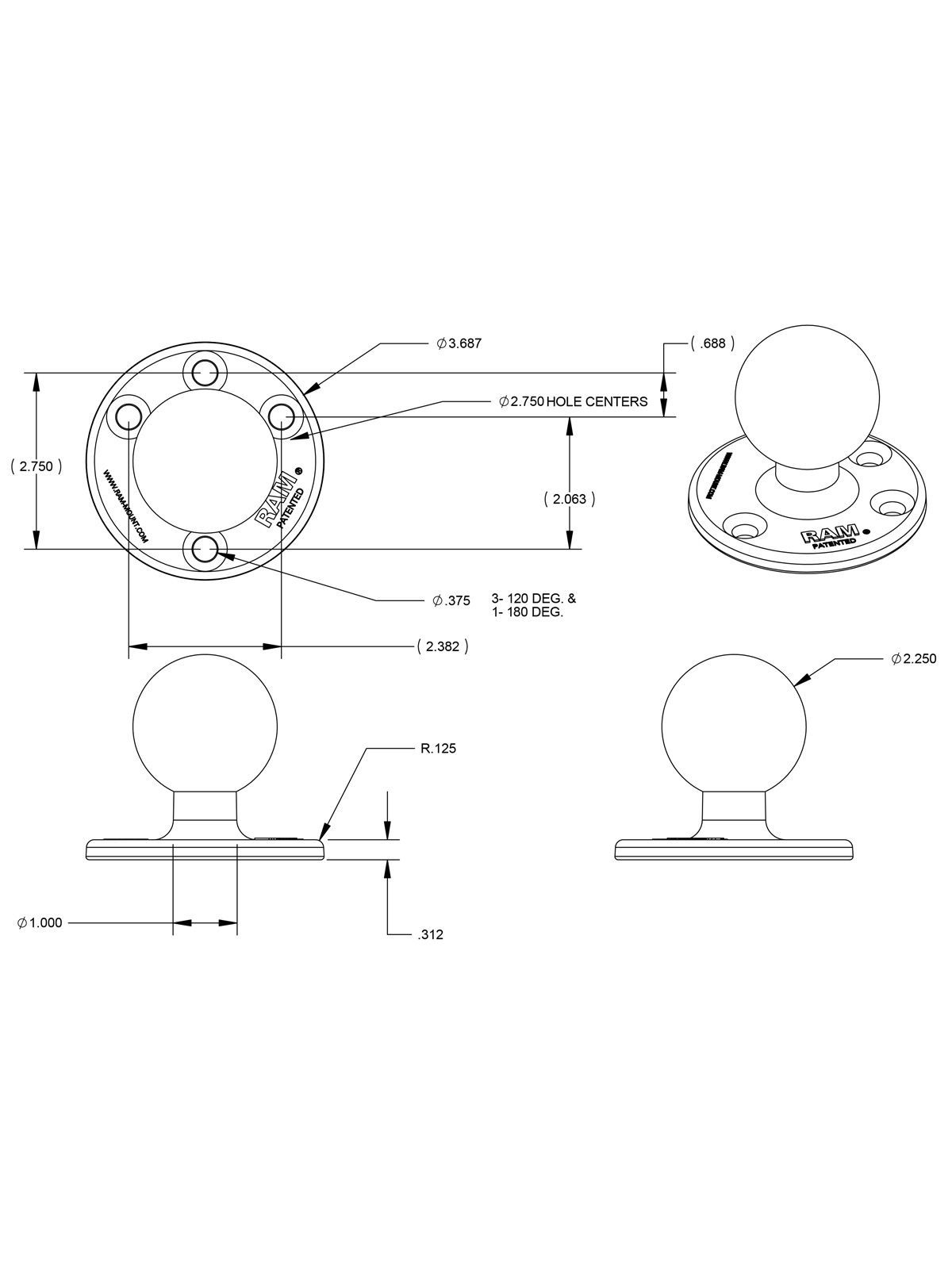 Runde RAM Mounts Basisplatte mit einer D-Kugel (2,25 Zoll), die senkrecht zur runden Grundfläche steht. Die Basisplatte mit vorgebohrte Löchern - 2 Stück im 180° Winkelraster bzw. 3 Stück im 120° Winkelraster - bildet die Grundlage vieler Befestigungslösungen. Sie eignet sich zur Anbringung an glatten, vertikalen oder horizontalen Flächen.