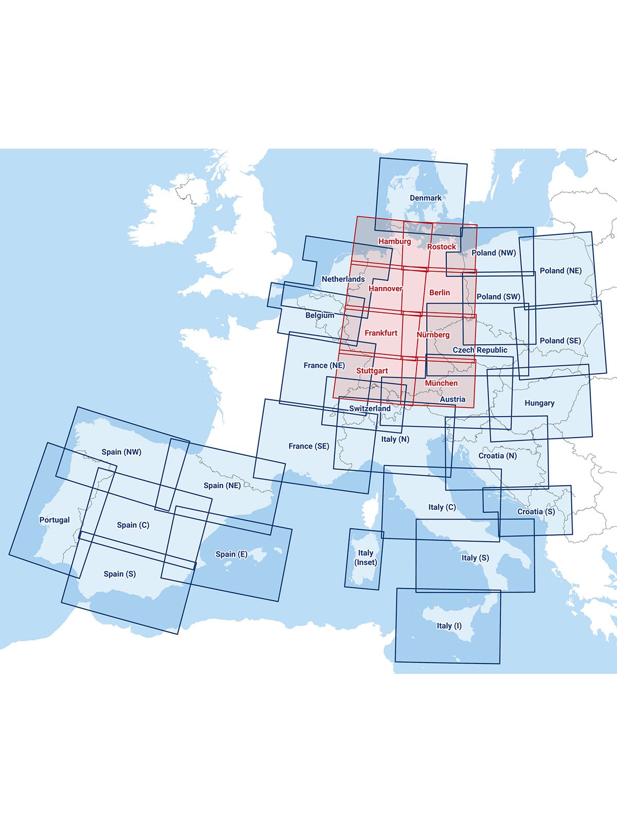 Die Luftfahrtkarte ICAO Deutschland umfasst insgesamt acht Kartenblätter - Hamburg, Rostock, Hannover, Berlin, Frankfurt, Nürnberg, Stuttgart und München.